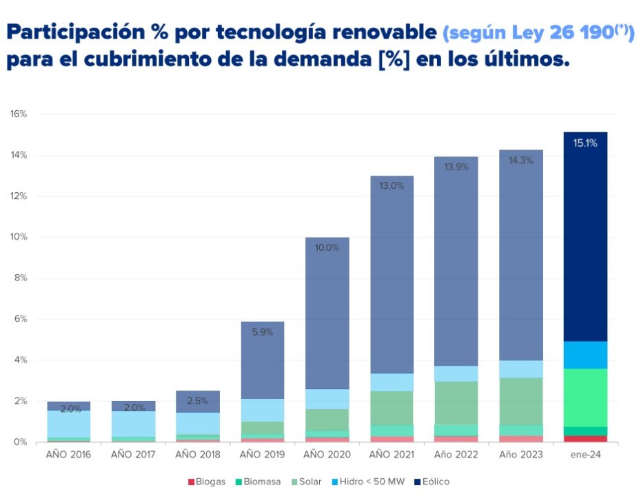 El peso de las energías verdes en la matriz nacional se ubica en la cima de los registros de Cammesa, que dan cuenta que los promedios de todos los años anteriores fueron mucho menores: en 2023 fue del 14,3%, en 2022 del 13,9%, en 2021 del 13% y en 2020 de solo el 10%, mostrando un claro crecimiento progresivo.
