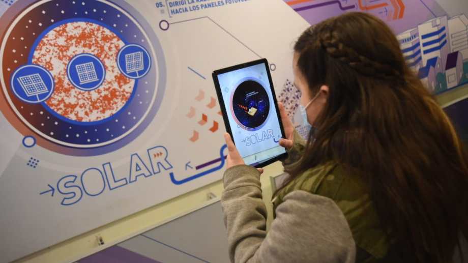 A través de una tablet que utiliza tecnología de realidad aumentada, el visitante puede interactuar con los dibujos que se encuentran en la pared. Al direccionar la cámara a ellos, el equipo brinda detalles sobre eficiencia energética y generación renovable. Por ejemplo, caracteriza las instalaciones del parque eólico Manantiales Behr, emplazado arriba de uno de los yacimientos más antiguos de YPF.