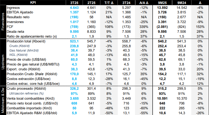 En este sentido, en el plano financiero, el indicador financiero EBITDA ajustado ascendió a US$1.357 millones -un 21% más que en el trimestre anterior- gracias al crecimiento de la producción de petróleo shale y la significativa reducción de casi 30% del costo de extracción debido a una menor exposición a campos maduros.