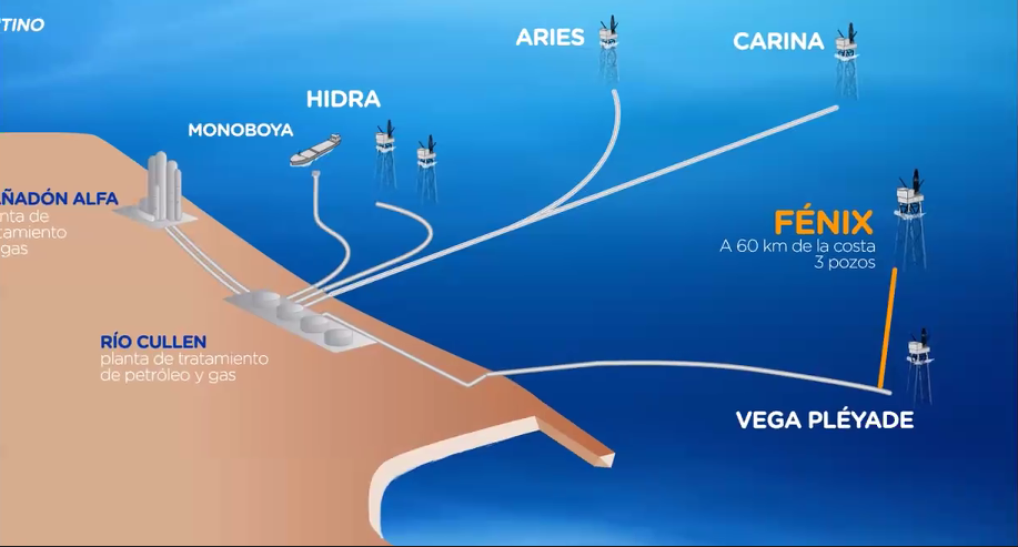 «Fénix tuvo muchísimos estudios para determinar cuál era la mejor forma de desarrollar la plataforma», indicó. Finalmente en vez de plantear una línea directa, decidieron instalar una de 35 kilómetros que lo conectará con Vega Pléyade. «Desde el punto de vista económico del proyecto y desde el punto de vista de reservas estuvimos las tres compañías de acuerdo con esta opción», detalló Robles.