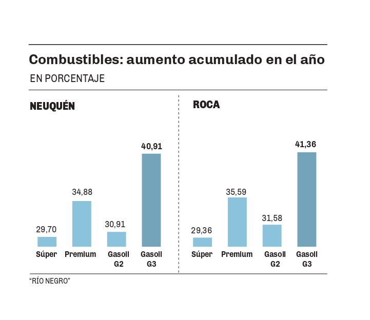En General Roca los saltos son aún más marcados y comienzan en un 29,36% para la nafta súper y llegan al 41,36% para el gasoil premium.
