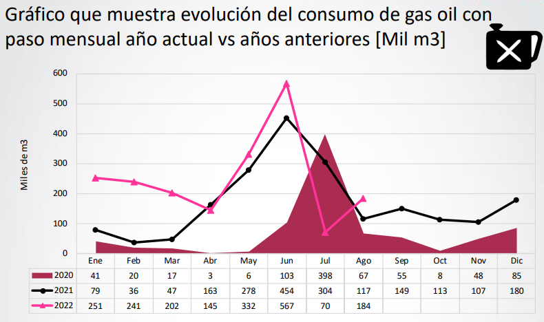 Para tener una dimensión de qué implica este volumen previsto para el 2023 vale señalar que de acuerdo a la Compañía Administradora del Mercado Mayorista Eléctrico (Cammesa) entre enero y agosto de este año el consumo de gasoil para la generación térmica sumó 1.992.000 metros cúbicos.