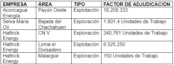 Se presentaron tres empresas, con un total de cinco ofertas. Una de ellas es Aconcagua Energía, para explorar el área Payún Oeste. Después está Selva María Oil, que busca quedarse con el área Bajada del Chachahuen. Se suma Hattrick Energy, que se postuló para las áreas CN V, Loma el Divisadero y Malargüe. Las inversiones irán destinadas exclusivamente al desarrollo de las áreas.