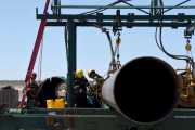 La planta de Doble Junta en el renglón 2, fotografiada por Gonzalo Salinas. Esta es una soldadora industrial que permite reducir los tiempos de obra, ya que suelda de forma automática dos caños de 12 metros de largo para convertirlos en ductos de 24 metros.