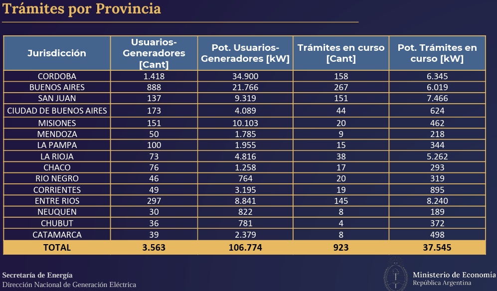 En cuanto a los trámites en curso, la provincia registró apenas ocho solicitudes activas, que representaron una potencia potencial de 189 kW, una cifra que reforzó su posición rezagada en el ranking nacional .