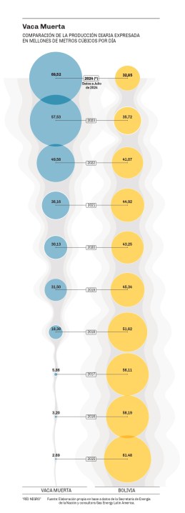 Así, mientras en 2015 Bolivia tuvo su pico de producción con 61,48 millones de metros cúbicos diarios, ese nivel ya fue superado en Vaca Muerta pues en los primeros siete meses de este año (es decir en los datos registrados hasta el momento ya que en días se conocerá la producción de agosto), se alcanzó un promedio de 69,52 millones de metros cúbicos.