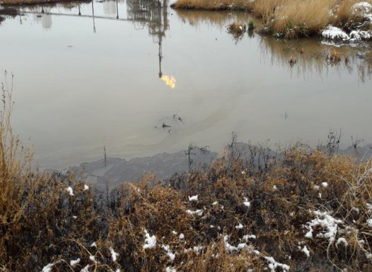 Los inspectores de Ambiente recorrieron las 8 hectáreas que tiene el complejo, y junto a irregularidades como la presencia de tanques sin tapas en los que almacenaba aceite, detectaron una enorme laguna con presencia de hidrocarburos justo a un lado de la antorcha o flare, ese fósforo que por seguridad se mantiene prendido mientras el complejo está en operaciones.