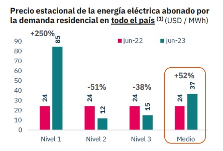 En el caso de los usuarios de Nivel 1, de ingresos altos, el aumento interanual fue de 250% y pasó de los US$ 24 por MWh en junio de 2022 a los actuales US$ 85 por MWh. Mientras que en el caso de los usuarios de menores recursos (Nivel 2 y 3) se registró una caída en el precio estacional del 51% y 38%, respectivamente.