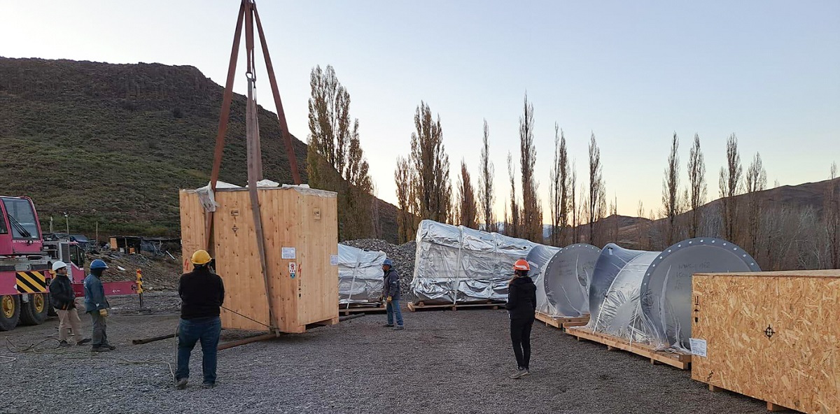 Luego un recorrido de más de 15.000 kilómetros, que incluyó el cruce de Los Andes, llegaron a Villa del Nahueve las piezas clave para ensamblar las turbinas del proyecto multipropósito Pedro Salvatori. Se trata de los ocho contenedores que llegaron a Chile el mes pasado, procedentes de Austria.