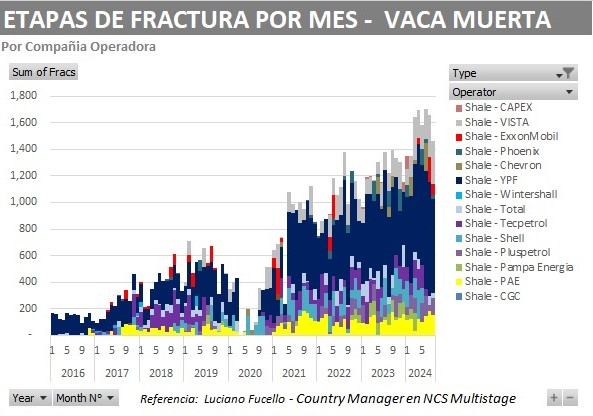 Si bien en la comparación histórica de los trabajos en Vaca Muerta no se trata de un mal mes, sí desentona con los volúmenes de trabajo que se venían dando en este año, y de hecho para encontrar un nivel tan bajo hay que retroceder hasta febrero, bien al inicio de la gestión de Milei, cuando las métricas fueron de 1348 etapas, en un mes con menos días.