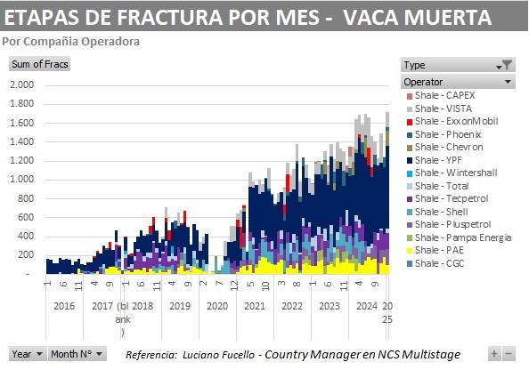Durante el último semestre del año pasado fueron en promedio 6 las empresas activas por mes, mientras que en este primer mes del 2025 se trató de 8 operadoras: YPF, Pluspetrol, Tecpetrol, Chevron, Vista, Pan American Energy (PAE), TotalEnergies y Phoenix Global Resources (PGR).