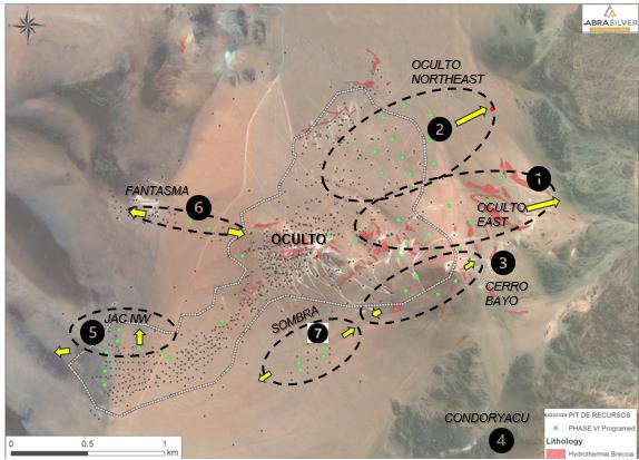 Además, la Fase VI incluye perforaciones dirigidas para evaluar mineralización alojada en sulfuros y de estilo pórfido en los sectores Oculto Deep y Cerro Viejo, así como trabajos adicionales en las zonas JAC, Sombra y Fantasma, con el objetivo de analizar la extensión de la mineralización conocida y su continuidad entre depósitos.
