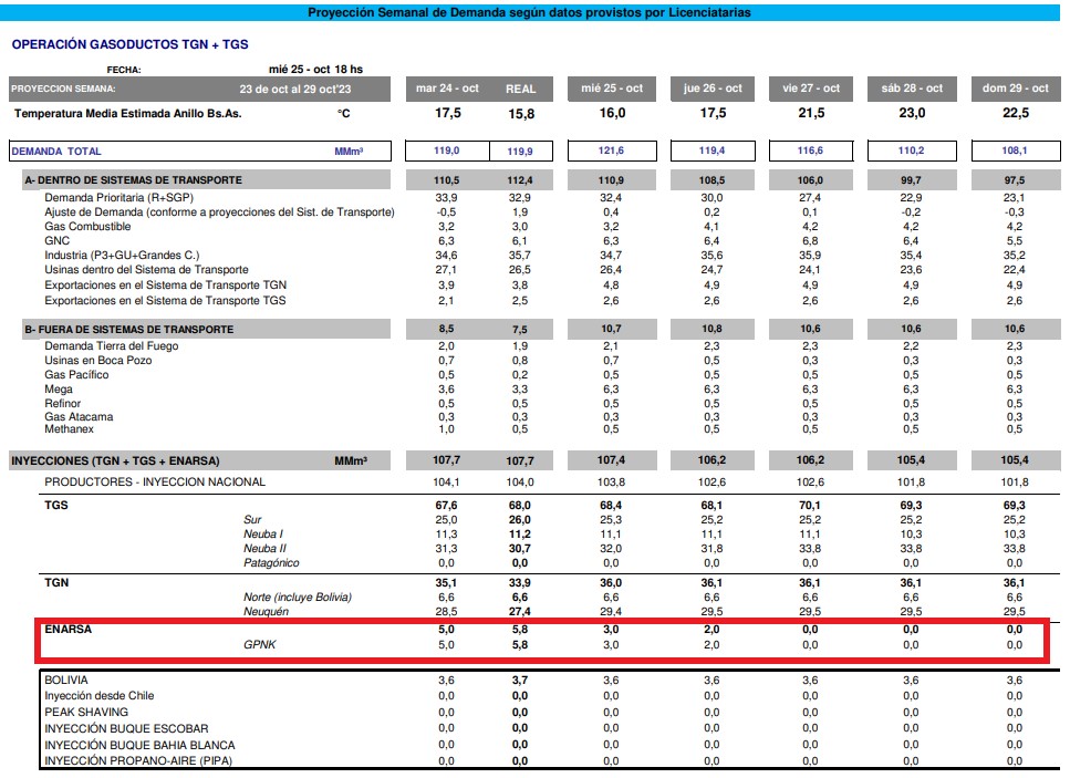 En el sistema del Enargas se determina de esa manera el volumen de gas estimado, y luego el real, el que efectivamente se despachó. Y justamente, la proyección de demanda estimada para hoy viernes, mañana y el domingo, da cuenta de que el flamante Gasoducto Néstor Kirchner no será necesario y no tendrá nada de gas que transportar.