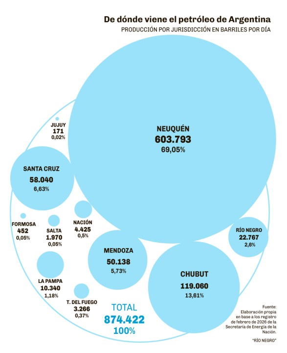 Dicho de otra forma, casi 7 de cada 10 barriles del país provienen de Neuquén, desde donde se espera que la producción siga creciendo.