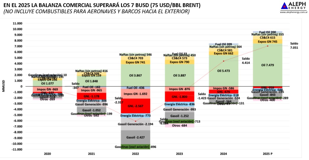 La balanza comercial energética, la ecuación entre las exportaciones y las importaciones de energía, ha sido un verdadero dolor de cabeza en los últimos años, con rojos que sumaron miles de millones de dólares. Tras un 2024 que cerró con signo positivo, para este año las proyecciones son más que alentadoras y según la consultora Aleph Energy se podría llevar a un superávit de más de 7.000 millones de dólares.