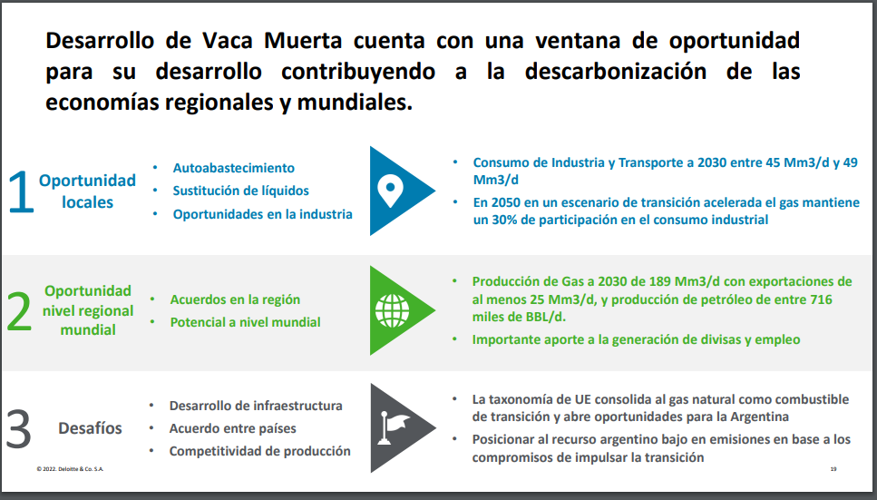 Promover el desarrollo de Vaca Muerta como oportunidad para contribuir a la descarbonización de las economías regionales y mundiales; establecer una estrategia para el desarrollo de hidrógeno verde y promover la reducción de emisiones no energéticas y la economía circular en todos los sectores como acelerador transversal.