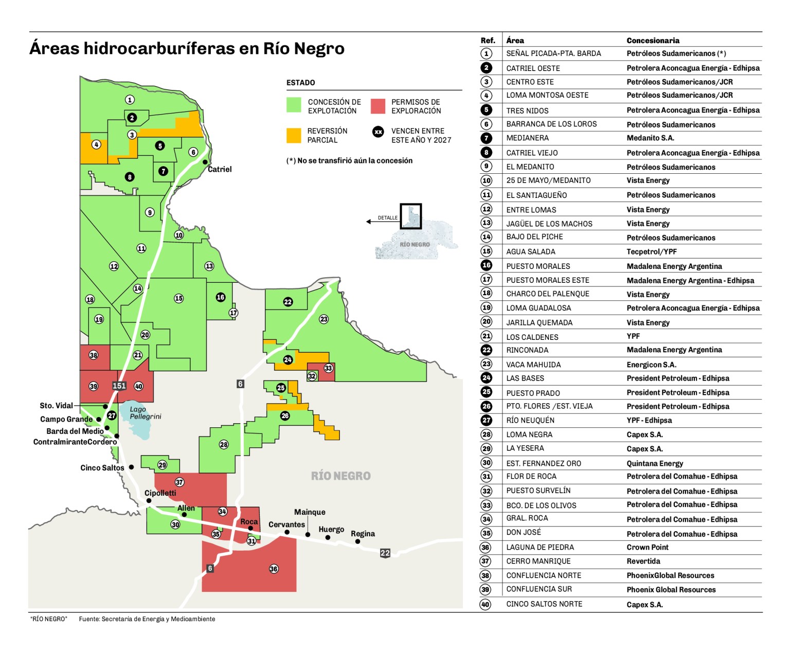 Las áreas que por medio del decreto se marcó la extinción de la concesión son Medianera y Rinconada-Puesto Morales. En el primer caso, el bloque Medianera ubicado al oeste de Catriel estaba en manos de la compañía Medanito SA, que viene de atravesar complicaciones financieras.
