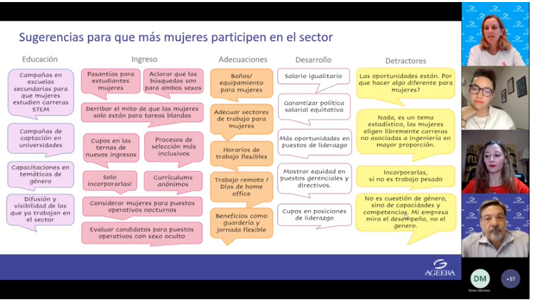 A su vez, que la participación de mujeres en el sector es 17,9%, debajo del 19% en el sector industrial, y muy atrás de la media (32%); en cuanto a los directorios, la participación de mujeres es relativamente alta (12,5%), no así en puestos técnicos y de liderazgo.
