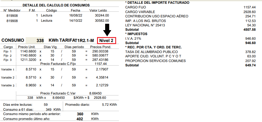 Por su parte, Edersa identifica al grupo dentro de la sección con información sobre los consumos, después de nombrarse la categoría tarifaria (en el ejemplo presentado es T1R2, de consumos mayores a 150 kWh). En este caso, el usuario no está en el grupo que pierde los subsidios ni tampoco sufrirá la quita si supera el tope del consumo.