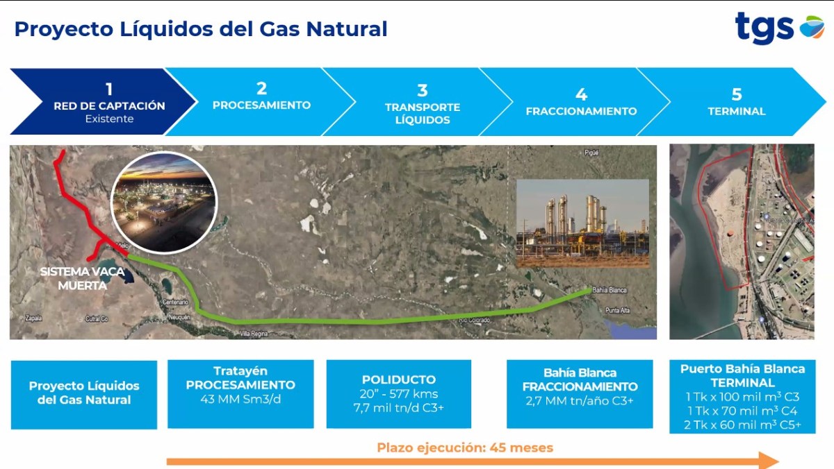 El proyecto se denomina Liquidos del Gas Natural, y además de buscar tener los beneficios del Régimen de Incentivo a las Grandes Inversiones (RIGI) se detalló que partirá de la ampliación de Tratayén, donde se separán los líquidos que serán enviados por un poliducto a construir que atravesará cuatro provincias y terminará en la zona de Bahía Blanca.