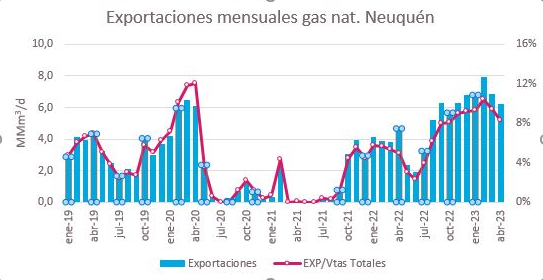 Durante abril las exportaciones de gas alcanzaron los 186,16 millones de metros cúbicos, lo que equivale a unos 6,21 millones por día. Esto representa el 8% de las ventas de gas provincial. El precio promedio de estos envíos fue de 7,89 dólares el millón de BTU, alcanzando un valor total de 56,6 millones de dólares.