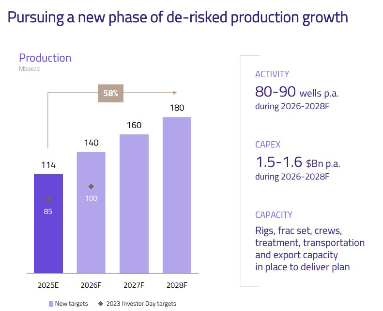 Es que el objetivo de la operadora es poner en producción entre 80 y 90 nuevos pozos por cada año, para elevar así la producción de petróleo, de los actuales 114.000 barriles equivalentes de petróleo por día, a 140.000 boes en 2026, 160.000 boes en 2027 y 180.000 boes en 2028. Una hoja de ruta que incluyó una visión a 2030 en la que la meta está aún más allá, en los 200.000 barriles equivalentes por día.