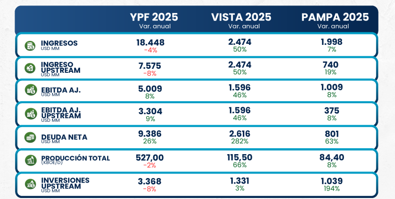 En ese contexto, YPF se consolidó como la compañía de mayor escala del país dentro del upstream. La empresa registró ingresos por US$ 7.575 millones y un EBITDA de US$ 3.304 millones en este segmento, lo que representó cerca de dos tercios del EBITDA total de la compañía. Además, destinó US$ 3.368 millones a inversiones en exploración y producción durante 2025, posicionándose como el principal inversor del sector.