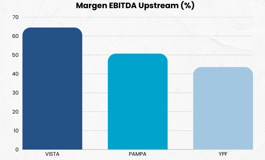 Más allá de las diferencias de escala, el informe señala contrastes importantes en términos de rentabilidad operativa. Vista registró el mayor margen EBITDA dentro del segmento upstream, con 64,5%, impulsado por su fuerte orientación hacia la producción de shale oil. Pampa Energía alcanzó un margen de 50,7%, mientras que YPF presentó un margen de 43,6%.