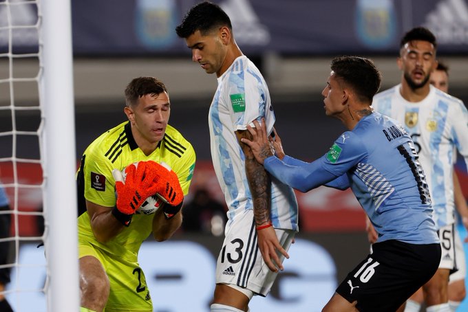 El partido arrancó movido y con un par de situaciones, una para cada bando. De entrada nomás, Argentina no marcó bien en el lateral izquierdo, el balón le quedó a Luis Suárez quien no dudó y buscó el arco. Sin embargo se encontró con la resistencia de Emiliano Martínez, con firme presencia en el primer palo.