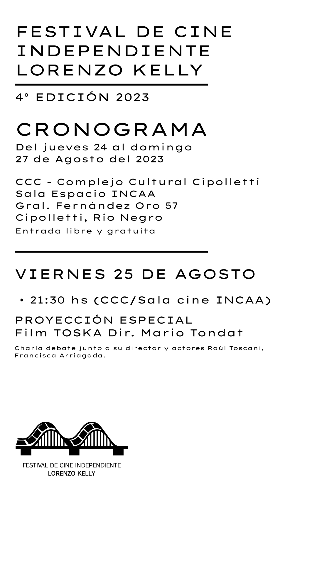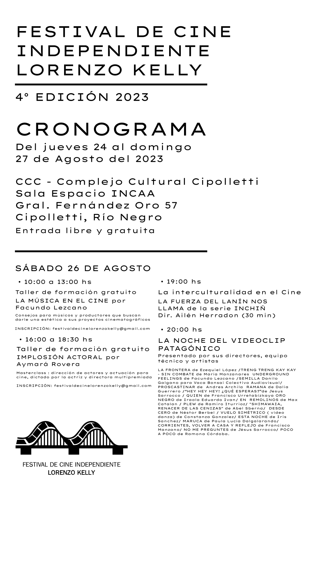 Este jueves comienza la cuarta edición del Festival de Cine Independiente Lorenzo Kelly en el Complejo Cultural Cipolletti, con entrada libre y gratuita. El evento, que este año tiene como eje temático la identidad territorial, se extenderá hasta el domingo y en el cual se podrá disfrutar de una competencia de cortometrajes patagónicos con 20 producciones participantes y otros veintiún clips patagónicos también en competencia; dos talleres de formación y dos películas en lo que es la muestra de cine.