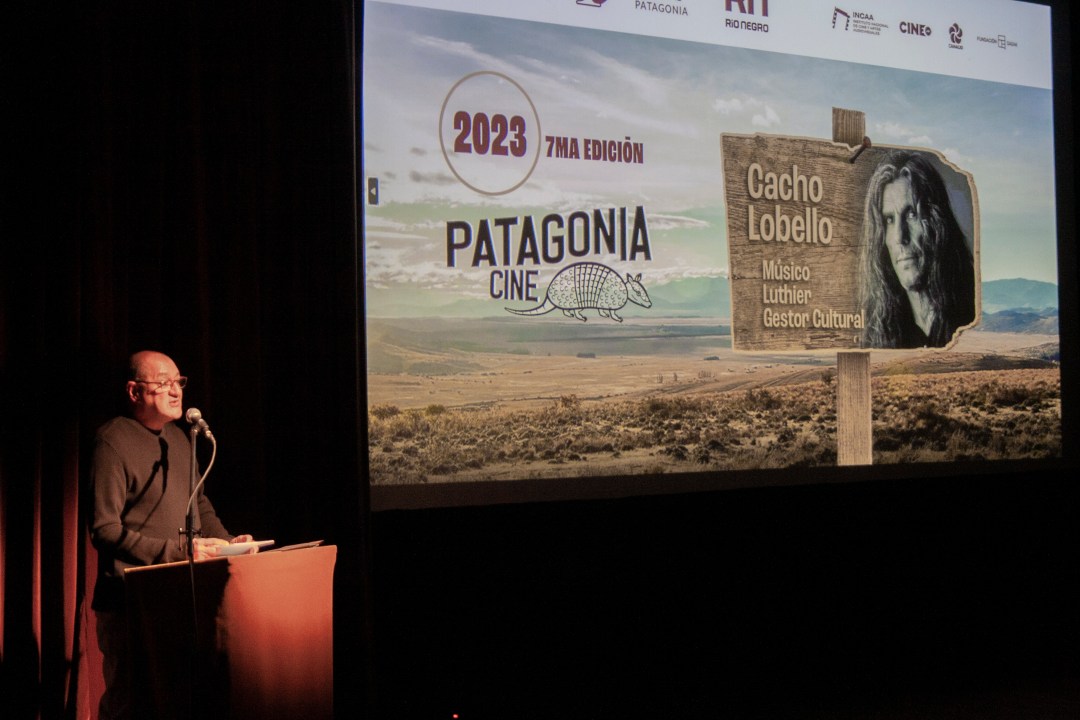 Fue también una ceremonia emotiva por otras razones. Por un lado, porque esta edición del Patagonia cine está dedicado a la memoria de Cacho Lovello, el músico roquense que murió en agosto de este año. En la pantalla se vio un corto sobre su pasión por Maruchito, y sobre aquella vez que pedaleó 200 kilómetros para llegar hasta donde está el santuario. En su homenaje, el festival hizo remeras con una caricatura de Lovello.