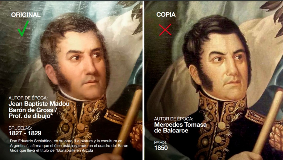 La conocida “pintura de la bandera” de 1828, del artista belga Jean B. Midou y la imagen de San Martín, luego del trabajo de reconstrucción de Ghigliazza.