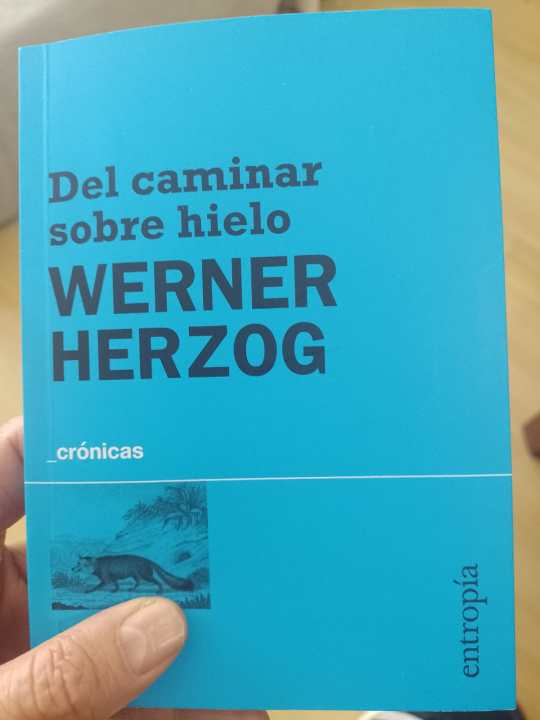 El libro que escribió el cineasta Werner Herzog, Del caminar sobre hielo, un libro pequeñito y precioso editado por Entropia que narra la tozudez y prepotencia del realizador cinematográfico, que «salvó» a su amiga por sólo caminar hacia ella. ¿Qué cuenta?. A fines de 1974 llamaron a Herzog para decirle que la crítica Lotte Eisner estaba muy enferme en París y a punto de morir. Él tomó un abrigo, una brújula y un buen calzado para caminar los 800 kilómetros que la separaban de ella, convencido de que si hacía ese trayecto no moriría. «Nuestra Eisner no debe morir, no va a morir, yo no lo permito. No morirá, no. No ahora (…). Mis pasos son firmes. Y ahora tiembla la tierra. Cuando yo camino, camina un bisonte. Cuando descanso, reposa una montaña. Cuidado! No lo tiene permitido. No morirá», escribe.
