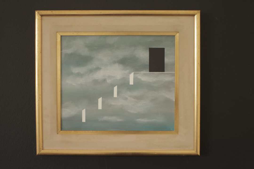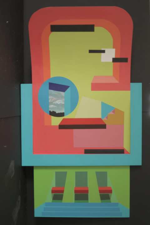 Por su parte, Didier Cheuquel mantuvo su estilo de geometrizar el paisaje patagónico, alrededor de su Cutral Co natal puestos en color, pero, esta vez, incorporó cielos, primero fotografiados y luego llevados al bastidor. Y a esos cielos le agregó puertas y ventas.