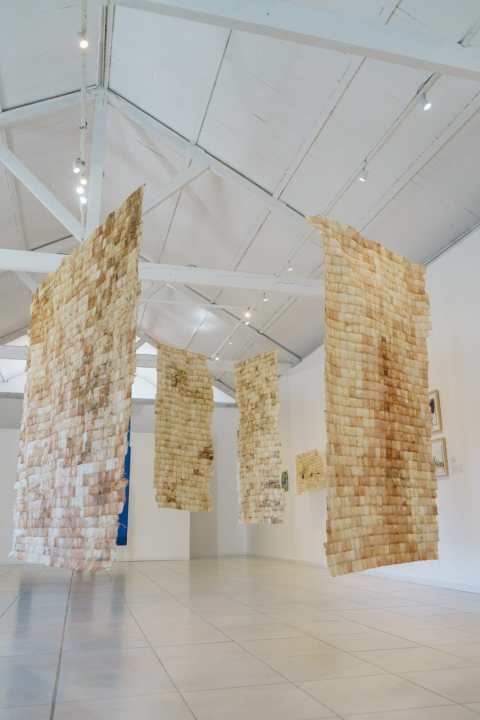 “Cosidos a mano, los saquitos van formando diferentes imágenes que funcionan como cartografías, por ejemplo, hay un mapa que se puede visualizar y que está puesto de determinada manera que tiene que ver con los territorios y los desplazamientos, hay mucho en la obra que trabajo que tiene que ver con los desplazamientos de multitudes”, dice Fernanda Rege.