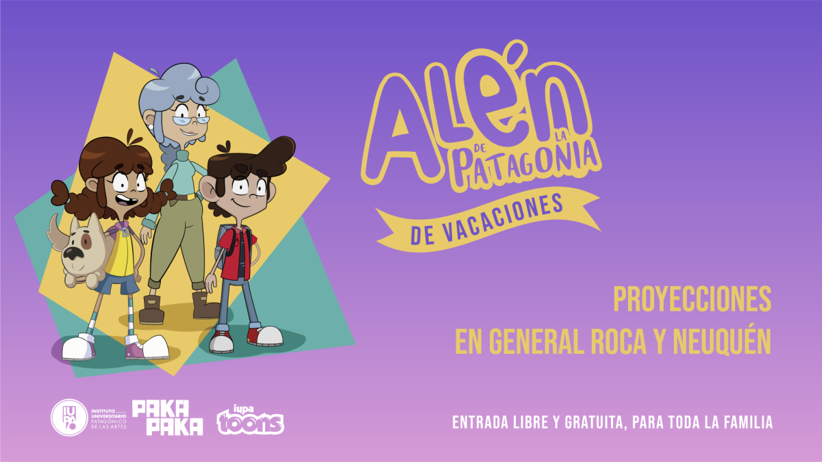 16:00: proyección de Alén de la Patagonia, la serie animada realizada por el Instituto Universitario Patagónico de las Artes (IUPA) en coproducción con PakaPaka, la señal de TV de contenido para las infancias de alcance nacional, tendrá diversas proyecciones en la región, a modo de preestreno.. La proyección se realiza como actividad promocional del Festival Audiovisual de Neuquén (FAN!), y es abierta y gratuita.