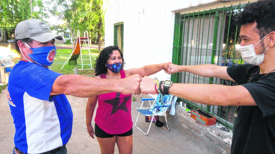 Lucas Morales, de 22 años, se recibió en 2018 y cursaba la licenciatura cuando se desató la pandemia. Hace nueve meses que trabaja en el Hospital López Lima en la ciudad del Alto Valle y desde el primer día abandonó la casa de sus padres porque son pacientes de riesgo. Alquila un monoambiente. Y cuando los visita, los "abraza" así.
