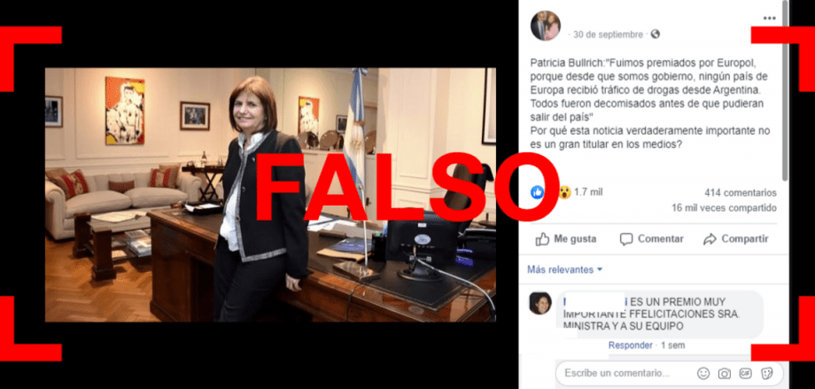 Circula en Facebook una publicación en la que se ve una foto de Patricia Bullrich, ministra de Seguridad de la Nación, acompañada por una frase supuestamente dicha por ella : “Fuimos premiados por Europol. Porque, desde que somos gobierno, ningún país de Europa recibió tráfico de drogas desde Argentina. Todos fueron decomisados antes de que pudieran salir del país”. Sin embargo, la ministra no hizo tal cual esta afirmación, sino que se trata de una frase adulterada. Pero, si se toma la frase que fue dicha realmente, según datos de las Naciones Unidas (ONU) es falso que ningún cargamento de droga llegó a Europa desde la Argentina, como aseguró Bullrich.