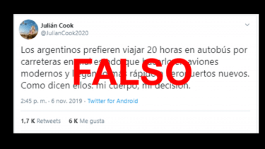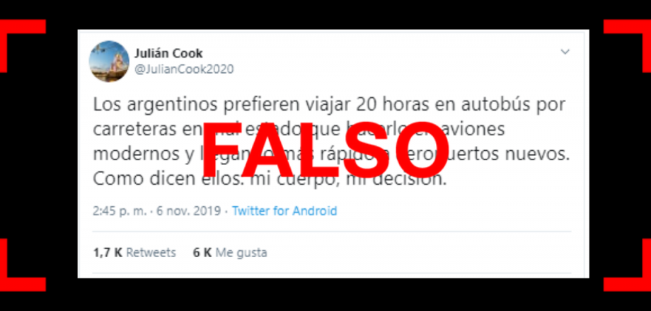 La cuenta @JulianCook2020 publicó un tuit que dice: “Los argentinos prefieren viajar 20 horas en autobús por carreteras en mal estado que hacerlo en aviones modernos y llegando más rápido a aeropuertos nuevos. Como dicen ellos: mi cuerpo, mi decisión” (sic). La publicación se produjo el mismo día en que se supo que el ex CEO y fundador de la aerolínea de bajo costo Flybondi, Julian Cook, abandonará el país, a raíz de la victoria de Alberto Fernández (Frente de Todos). Reverso pudo comprobar que el tuit y esa cuenta de Twitter son falsos.