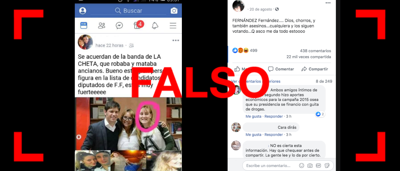Circula en Facebook una publicación con una foto del candidato a gobernador de la Provincia de Buenos Aires por el Frente de Todos, Axel Kicillof, con Tamara Blanco -conocida como “La Cheta”-, que irá a juicio oral como presunta organizadora de una asociación ilícita que les robaba a ancianos de la zona sur del conurbano. La imagen está acompañada por el siguiente texto: “Se acuerdan de la banda de LA CHETA, que robaba y mataba ancianos. Bueno esta gran persona figura en la lista de candidatos a diputados de F. F, estos muy fuerteeeee” (sic).
