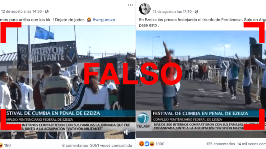 Circula por redes sociales el video de un festival de cumbia en el Complejo Penitenciario Federal de Ezeiza junto con el siguiente texto: “En Ezeiza los presos festejando el triunfo de Fernández. Solo en Argentina pasa esto”. Sin embargo, las imágenes no corresponden a los días posteriores a las últimas elecciones Primarias, Abiertas, Simultáneas y Obligatorias (PASO), sino que son de 2012.