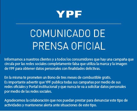 Desde YPF se remarcó que «YPF publica todas sus campañas por medio de sus redes oficiales y portal institucional y nunca te va a solicitar datos personales por medio de las redes sociales».
