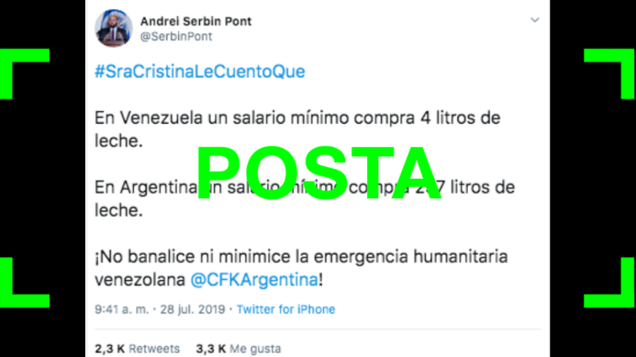 Bajo el hashtag “#SraCristinaLeCuentoQue”, Serbi Pont dijo en su Twitter: “En Venezuela un salario mínimo compra 4 litros de leche. En Argentina un salario mínimo compra 297 litros de leche. ¡No banalice ni minimice la emergencia humanitaria venezolana @CFKArgentina!”. Según pudo confirmar Reverso, esta información es verdadera.