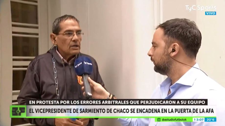 «Hemos agotado todas las instancias administrativas del reclamo ante la casa madre del fútbol argentino, solicitando las aclaraciones sobre lo que pasó. Nos robaron la ilusión del último ascenso y no hay ningún tipo de respuesta», explicó Escobar, mientras el móvil de TyC lo enfocaba y mostraba las cadenas.
