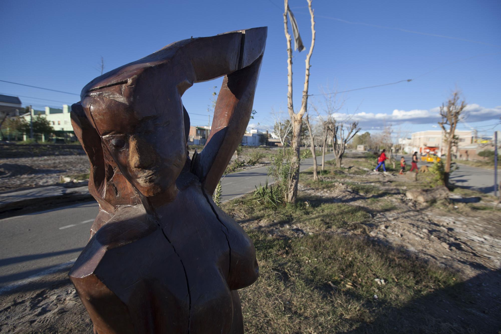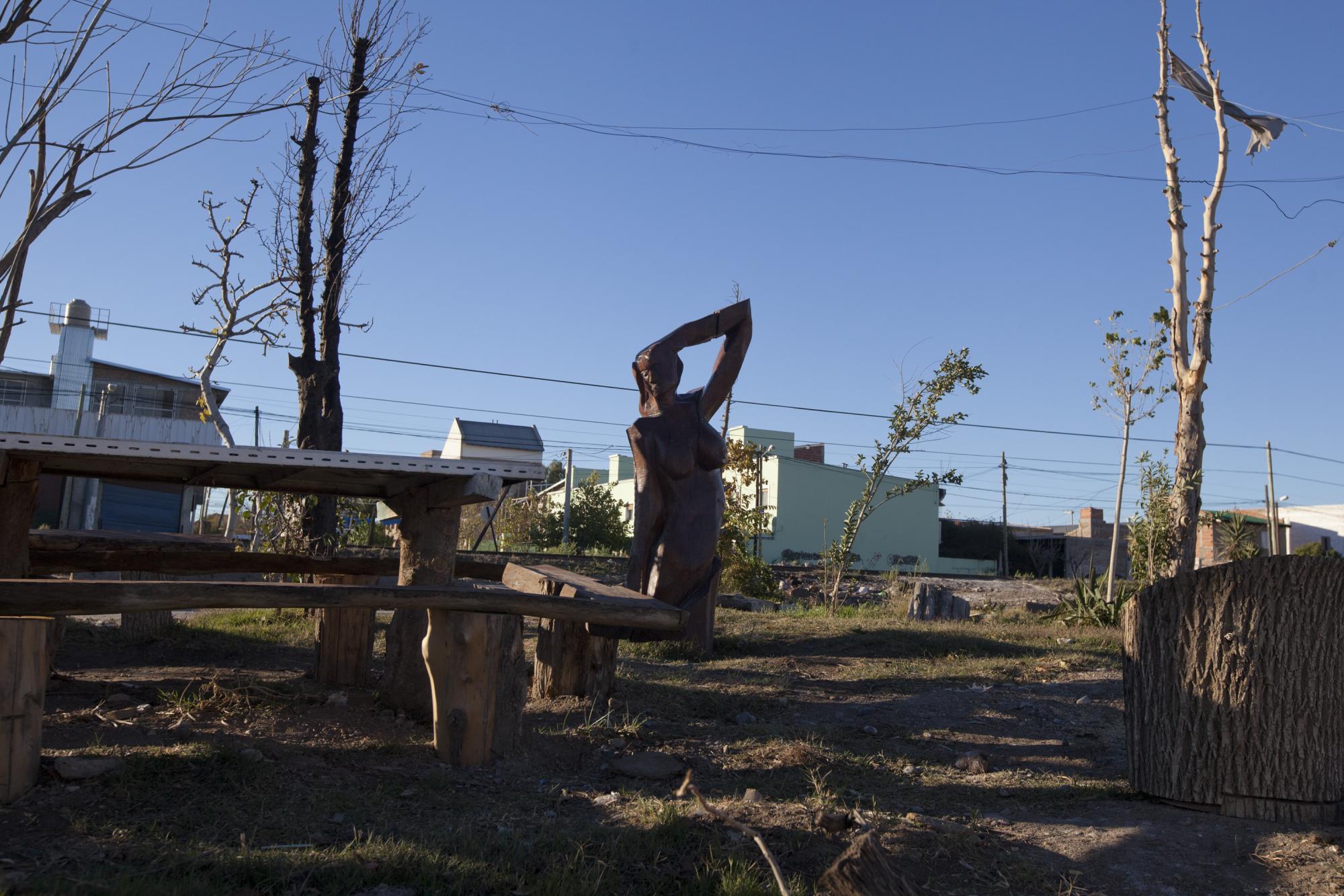 “Fui a limpiar el galpón y ahí encontré la escultura. Estaba sucia e incompleta. Le faltaban algunos detalles por terminar. La querían tirar, me ofrecí para llevarmela y me la dieron. La terminé y decidí ponerla al costado de las vías como un regalo al barrio La Sirena. También como un homenaje a las mujeres y un pedido de disculpas por parte de los varones”, contó Roberto. El hombre también colocó en el lugar una mesa y bancos que él mismos construyó con troncos de árboles que le encargaron derribar.
