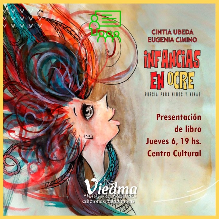Este jueves, desde las 19, en el hall del Centro Municipal de Cultura la escritora Cintia Ubeda presenta "Infancias en Ocre", su cuarto libro para niños y niñas, una obra de poesía para infancias con ilustraciones de la artista plástica Eugenia Cimino que ha sido editado por la editorial Patagónica Vela al Viento.
