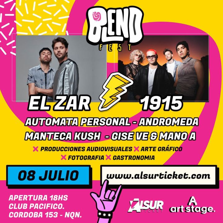 Blend Fest, el flamante ciclo de música y arte tendrá su primera edición el próximo sábado 8 de julio en el Club Pacífico (Alberdi 354, Neuquén) con un lineup encabezado por El Zar y 1915, dos de las mejores bandas del indie rock & pop argentino.
