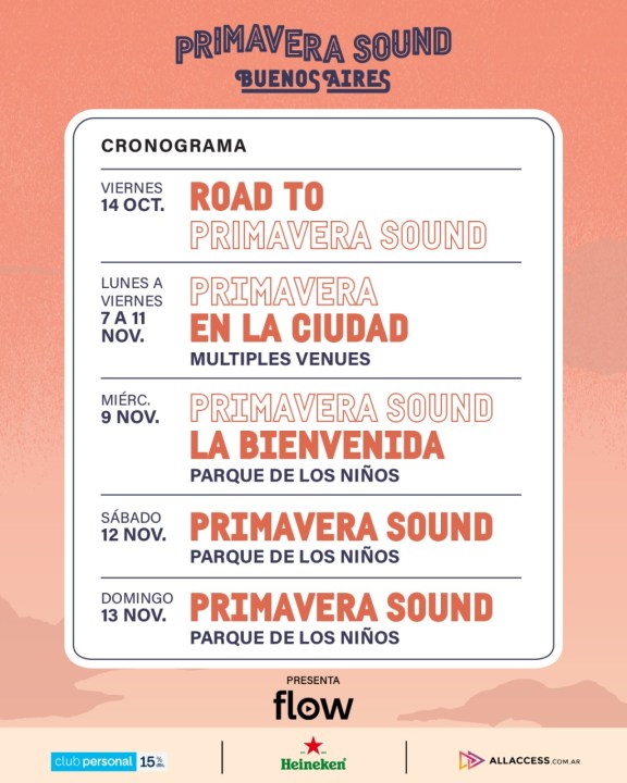 Por su parte, el lineup de Primavera Sound Buenos Aires respetará el mismo compromiso con el público, el cual se ha convertido en uno de los sellos del evento a lo largo de su historia: un cartel igualitario que refleja toda la paleta de colores de la música contemporánea, uniendo leyendas de la música con artistas del momento, referentes y discípulos, experimentación electrónica con canciones de autor y artistas intergeneracionales con voces que capturan su tiempo.