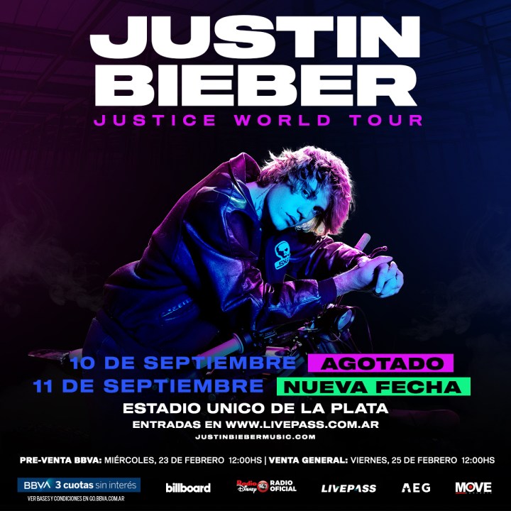 Justin Bieber agregó un segundo show en su visita a la Argentina en el marco de su Justice World Tour, ya que tras agotar las localidades de la fecha previamente anunciada del 10 de septiembre en el Estadio Único de La Plata, se le suma ahora otra para el día siguiente en el mismo escenario.