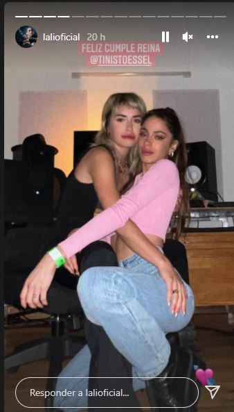Lali publicó una imagen abrazando a Tini con mucho cariño en un estudio de grabación, con sus brazos y piernas entrelazados con los de ella.